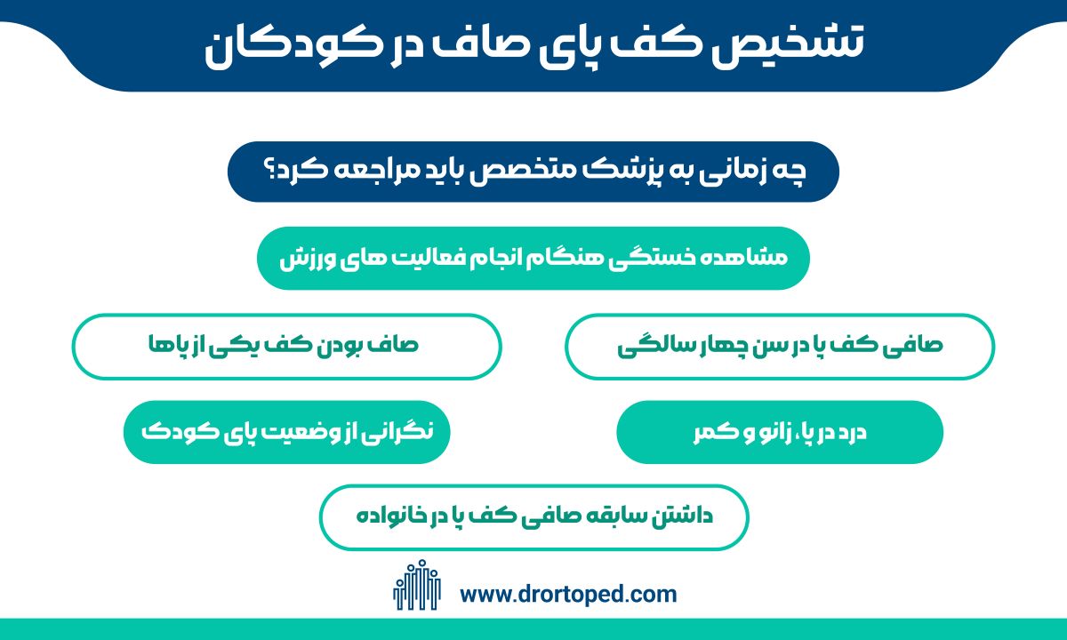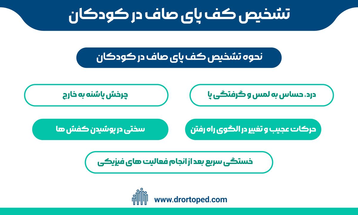 روش تشخیص کف پای صاف در کودکان، معمولا علائمی مانند درد و التهاب پا ها بررسی می شود. کف پای صاف در کودکان شایع ترین مشکل ارتوپدی است؛ که البته در بسیاری از موارد با افزایش سن، رشد کودک و شروع به راه رفتن کودکان از بین می رود. با این حال، کف پای صاف در کودکان می تواند نشان دهنده ی برخی بیماری ها عصبی و مادرزادی باشد.
